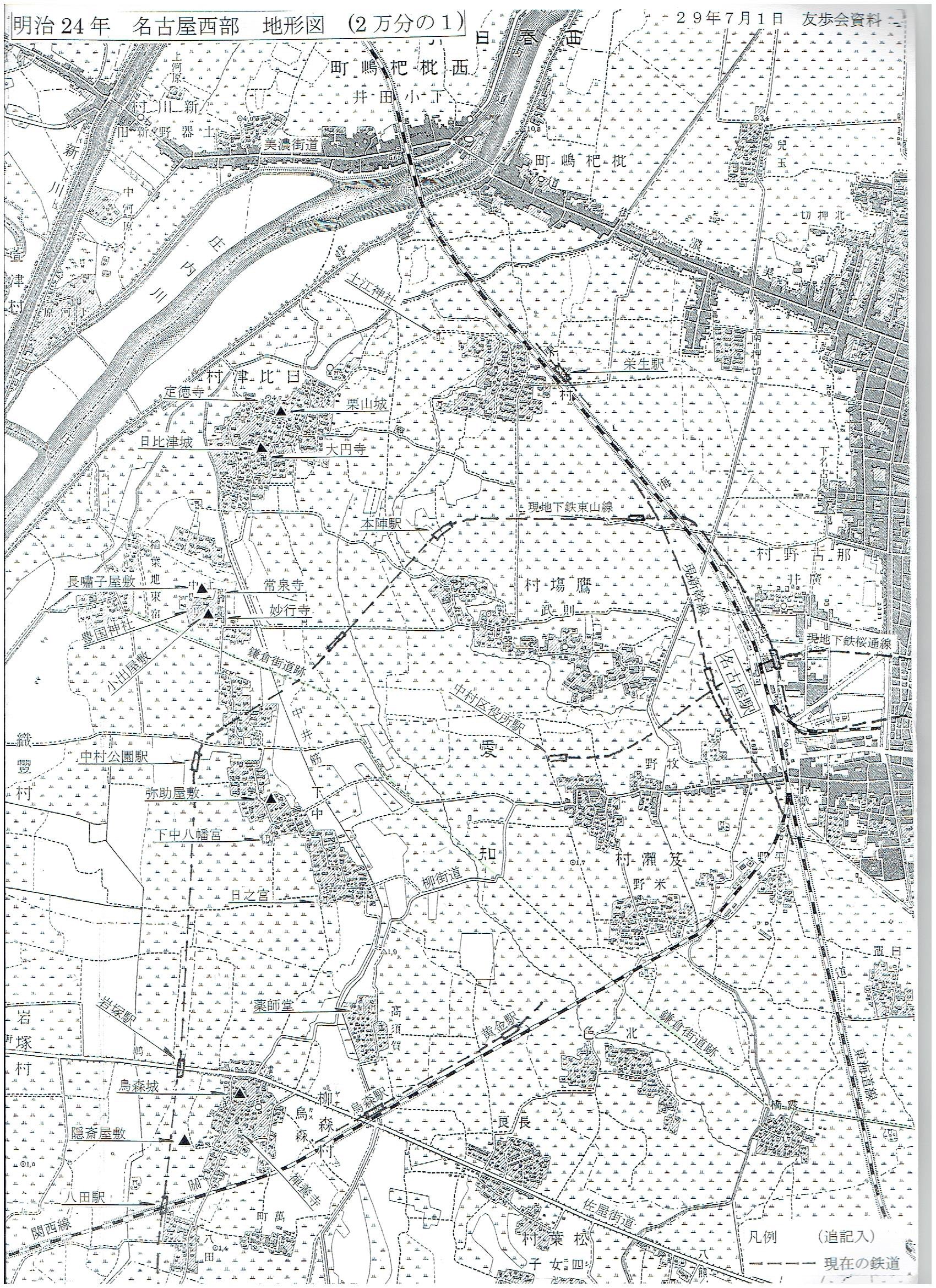 明治24年 名古屋西部地形図(2万分の1)(友歩会例会は、この図にある「庄内用水の中井筋」を南下した。) Top![]() |