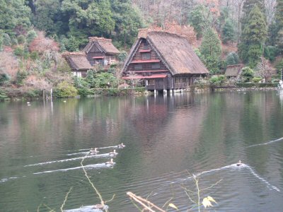 初冬の松尾池と合掌造りの岩船荘