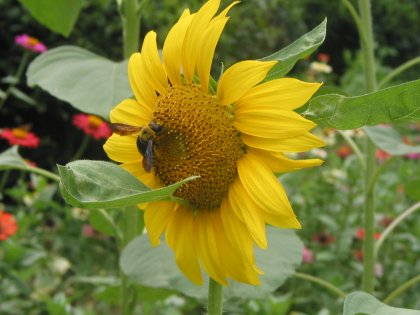 ひまわりの花に蜂が蜜を吸いに来ていた