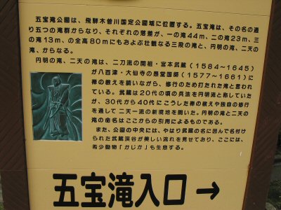 ![]() 五宝滝公園の案内看板(宮本武蔵修行の地) |