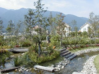 四季のふるさと「みのり乃湯」の前で 庭園の花々 癒しの庭園「四季の花」 庭園を囲むようにして建てられた住宅も風景に鮮やかな色合いを添えていました。 庭園を流れる小川(左)と体験農場付近の大カボチャ(右) 名神大垣インターから車で約15分 養老公園へ行く途中の田園にありました。 ホーム