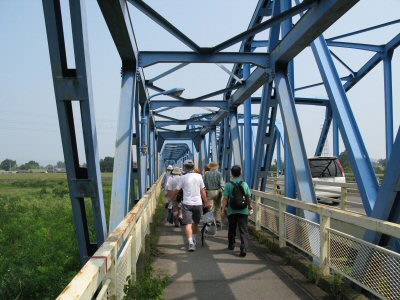 ![]() 河田橋の歩道を進む(下は木曽川) |