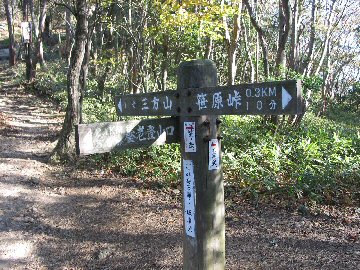 ![]() 笹原峠の道標 ここから三方山まで0.3km10分 |